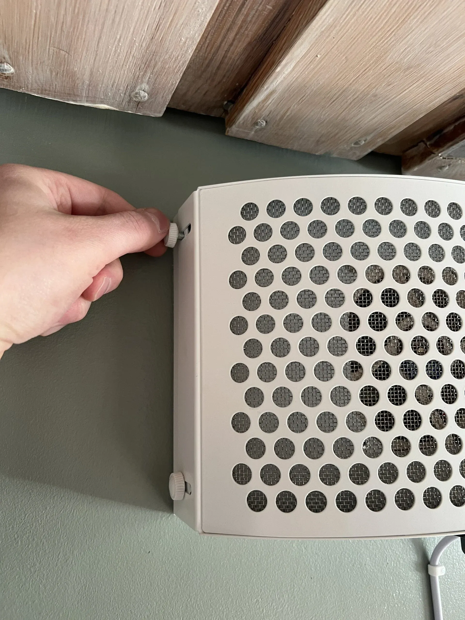 Ruuvaa sormiruuvit 4kpl sivuilta irti. Pidä samalla kiinni laitteen etukannesta
